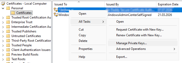Then we have to manage the permission to read this private key. We open certlm.msc go into the “Personal” store und under “All Tasks” we click on “Manage private keys“