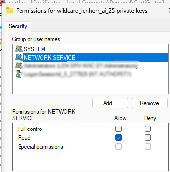 And grant the “Network service” user “Read” permission for the private key.