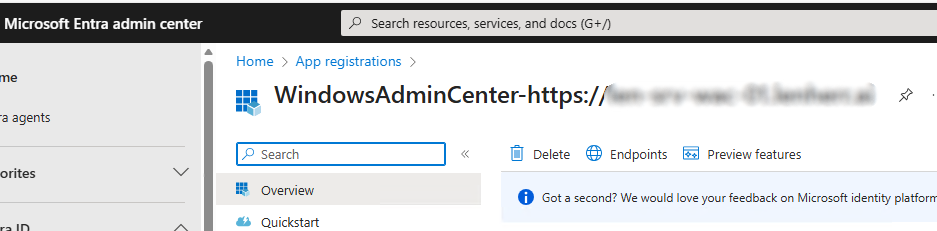 To check what happened exactly we can open the Microsoft Entra Admin Center. Under “App registrations we should see a WindowsAdminCenter application registration.