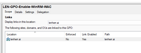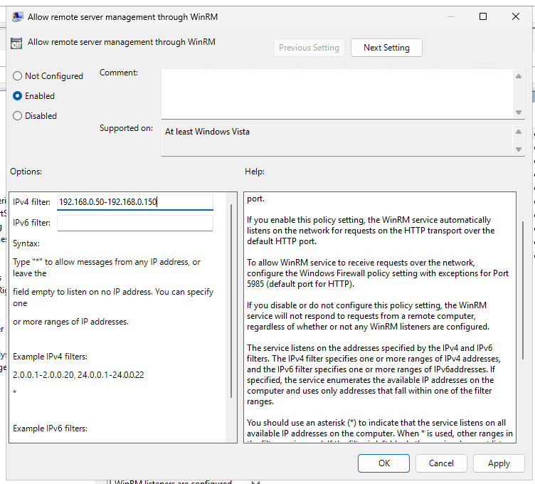 Under Computer Configuration > Policies > Administrative Templates > Windows Components > Windows Remote Management (WinRM) > WinRM Service, we set this GPO to Enabled.