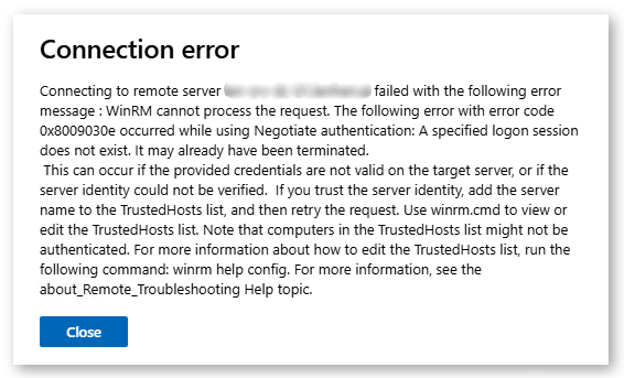 After adding the server to your WAC instance it is possible that you can’t connect right to it. If you get an error message similar to this one, some configurations have to be made.