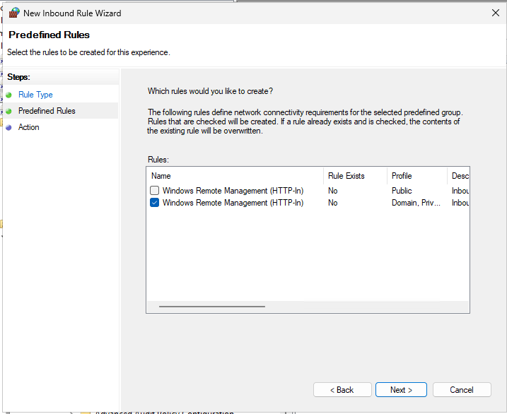 Under Predefined, we choose “Windows Remote Management”