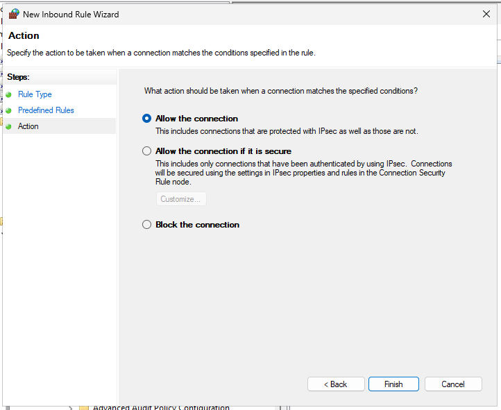 Under Computer Configuration > Policies > Windows Settings > Security Settings > Windows Defender Firewall with Advanced Security, we create a new inbound rule.