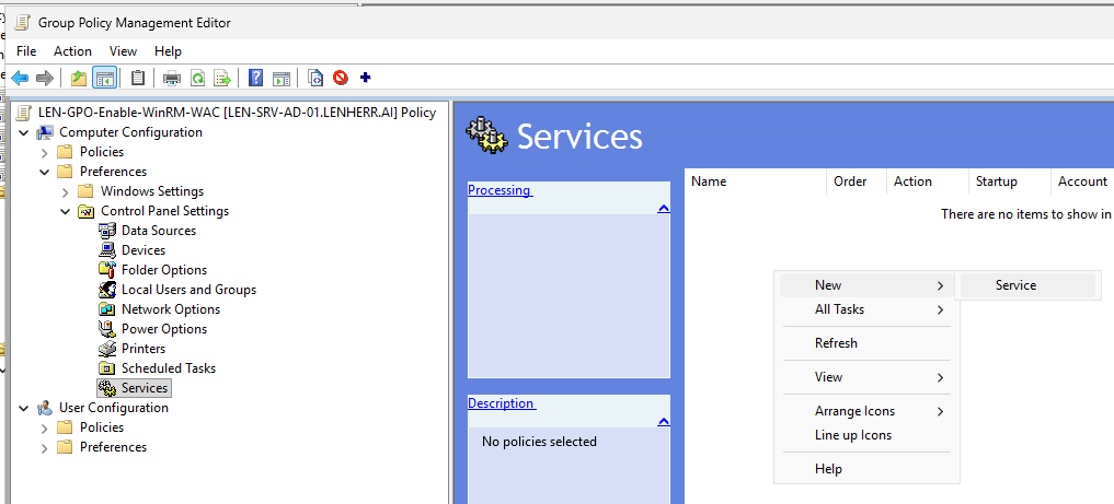 Under Computer Configuration > Preferences > Control Panel Settings > Services we create a new service.